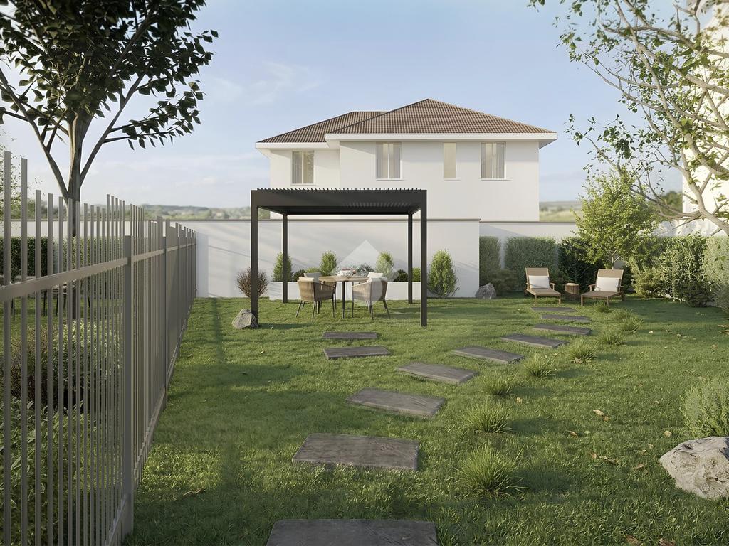 Le finiture prevedono i serramenti in PVC con doppio vetro camera, con finitura esterna effetto legno e gelosie in PVC coordinate in tinta legno. La pavimentazione in gres porcellanato effetto rovere chiaro.